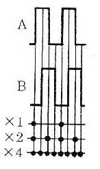 モータのロータリエンコーダ部からの信号から回転数を実際にカウントする回路。回転方向は、90度ずれた矩形波の変化する順番によって見分ける。カウントの方法には下図に示すように1、2、4逓倍のカウントの方法があるがこの回路では1逓倍でカウントする。また、負の数は補数表示となる。カウンタは16bitカウンタである。