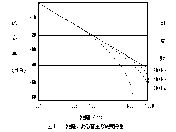 - 減衰質について超音波は距離が長くなるほど減衰している。また図1に示すように音波周波数が高くなる程減衰率が大きくなって到達距離が短くなる。通常周波数約100[KHz]では最大1〜2[m]検知可能距離となる。超音波では技術的にいえば1000[MHz]ぐらい迄発振可能となってきた。