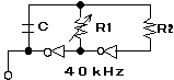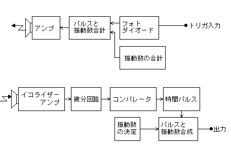シーケンサーによるパルスをフォカプラを通して伝え、その情報(一発パルス)とクロック(40kHz)とを合成して送信部から超音波を発射する。