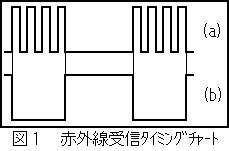 信号処理部の割込み信号発生部の原理はある時間Tのときの赤外線信号の状態とそれからt[μS](68230のToutより出力されるCLKによる)後の赤外線信号の状態とを比較し状態が変化していたときに割込み信号が発生するというものであるが信号を発生させるのに74LS574を使用している関係上、IS1U60が赤外線受光時に一発パルスを出力するというのは好ましくない。そこで周辺回路で一発パルスを引き伸ばすことにより信号変調を行う。