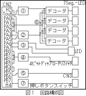 | 10 | PA2 | IN | 7Seg.-LEDdata(2) | 30 | PB4 | IN | テスト信号入力 |