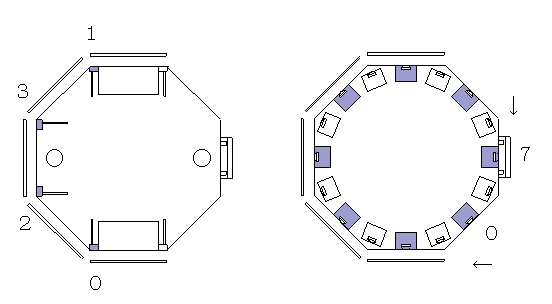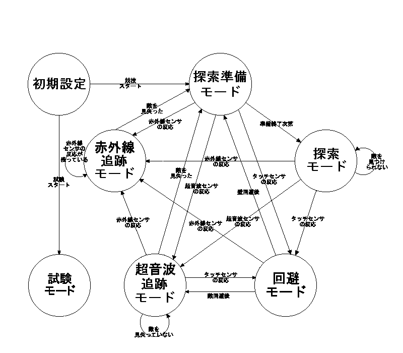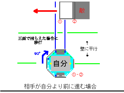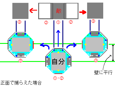 - 敵が左(右)に動くならば、その方向に90度旋回し、センサを右(左)モードにし、直進し、最初に戻る。