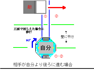 赤外線センサで相手の後ろを捕らえた場合のモード。このモードはどの他のモードからでも、どれかの赤外線センサに反応があったら入ることができる。