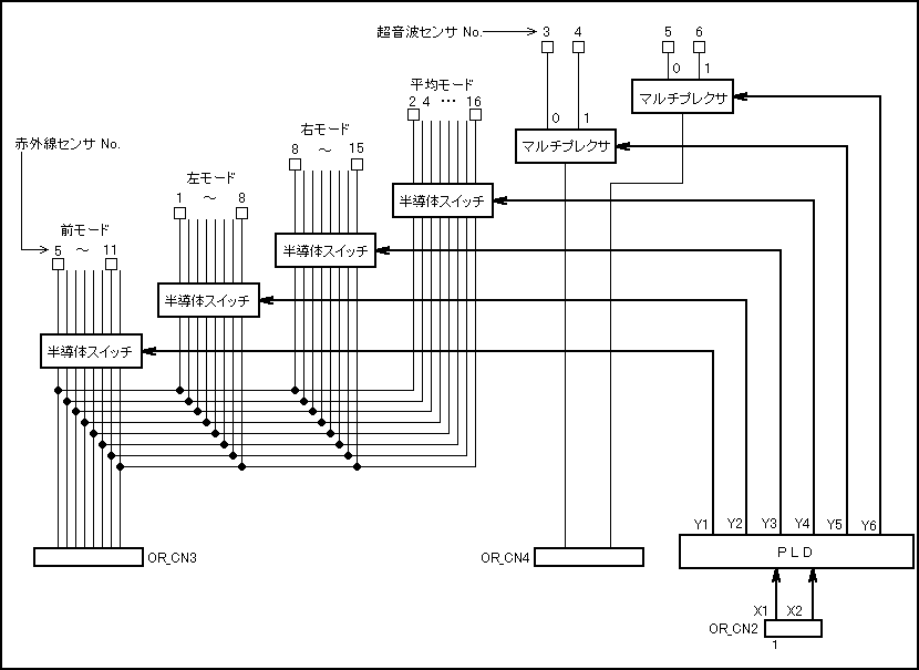 超音波センサと、赤外線センサの切り替えには、マルチプレクサと半導体スイッチを使用しする。