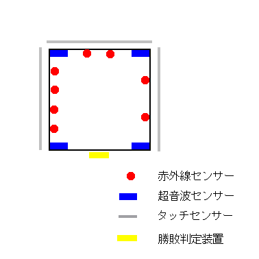 相手機との距離が20cmの所で止まったら今度は相手機のまわりをR=40cmで左回りにまわりながら赤外線センサーで相手機の赤外線センサーを探し、見つけたらすぐに90度左に回転し相手の勝敗判定装置を押す。またこの場合以外に右もしくは前の赤外線センサーが反応した時は反応した方を向きすぐ突進する。