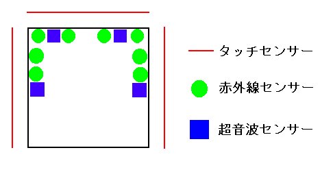 システム提案書 1.センサー配置図・上図の通り 2.戦略と特徴 ・相手を常に前方に捕らえ続け、後ろをなるべく見せない。 ・相手に接近するときは、できる限り相手の動きを先読みし、先行追尾する。 ・壁と適を区別するために自己位置の把握をする。 3.検討事項 用意すべきモードとその際使用するセンサー 索敵モード:超音波センサー 追尾モード:超音波センサー 攻撃モード:赤外線センサー 回避モード:超音波センサー、タッチセンサー ・割り込みの優先順位 1.超音波センサー、タッチセンサー反応時の回避(壁と敵から) 2.赤外線センサー反応時の攻撃 3.超音波センサーによる追尾 4.超音波センサーによる索敵 ・各モードの説明 索敵モード ・超音波センサーによって、自己位置を把握し、壁と敵が区別できるようにする。 また、進入禁止ゾーンに入ってないかを確認する。その後、左右180度以内の回 転を行い、適の位置の探し出す。 ・このモードを基本モードとする。 追尾モード ・適と思われる反応があったら、その方向へすばやく前を向かせ適方向へ移動する が、その際に前方2つの超音波センサーを使って、できる限り相手を捕らえ続け る。そしてその2つの超音波センサーで敵の現在の運動方向と速さを把握し、そ れに対し先読みした動きをして効率よく接近する。 ・接近したら相手とやく10cmから20cmの距離を保つ ・運動方向と速さは、ある時間での相手の位置と、それからわずかな時間経過して からの相手の位置を把握することによって知る。 ・追尾中に敵を見失ったら、索敵モードに移行する。 攻撃モード ・敵の赤外線を捕らえることができたら、その方向に直進する。 ・攻撃が失敗(敵を見失う)したら、索敵モードに移行する。 回避モード ・タッチセンサーが反応したら即座にこのモードに移行するが、攻撃モード中 ( 赤外線を捕らえている間)の前方のタッチセンサーの反応は回避モードに 移行しない。 ・具体的な回避行動は様々な場合に対応させるため、何通りかの回避行動パターン を用意する。 ・回避行動を終了したら、索敵モードに移行する。