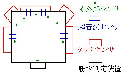 1st. タッチセンサー反応時の回避または攻撃 2nd. 赤外線センサー反応時の攻撃 3rd. 超音波センサーによる自己および相手位置の把握 4th. 超音波センサーによる相手への接近 |