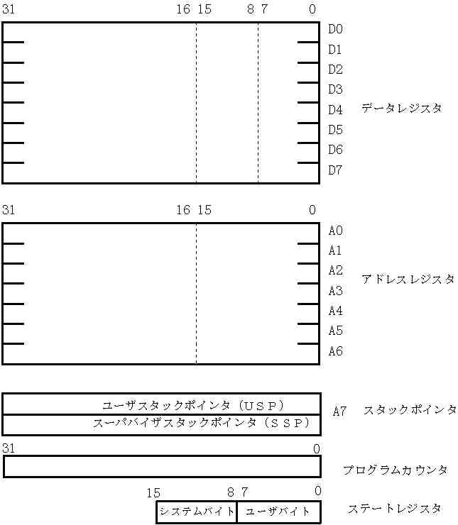 る。A0〜A6までがアドレスレジスタ、A7は裏表に分かれていて、それぞれスーパーバイザ用のスタックポイン