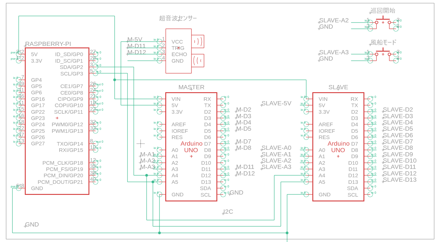 Raspberry Pi、Master Arduino、Slave Arduino間の接続および、超音波センサーの配線図を図4に示す。 ロボットの巡回モードボタンおよび風船モードボタンは、図4の右上に配置されている。 また、3つのマイコンのピン接続を、それぞれTable 1、Table 2、Table 3に示す。