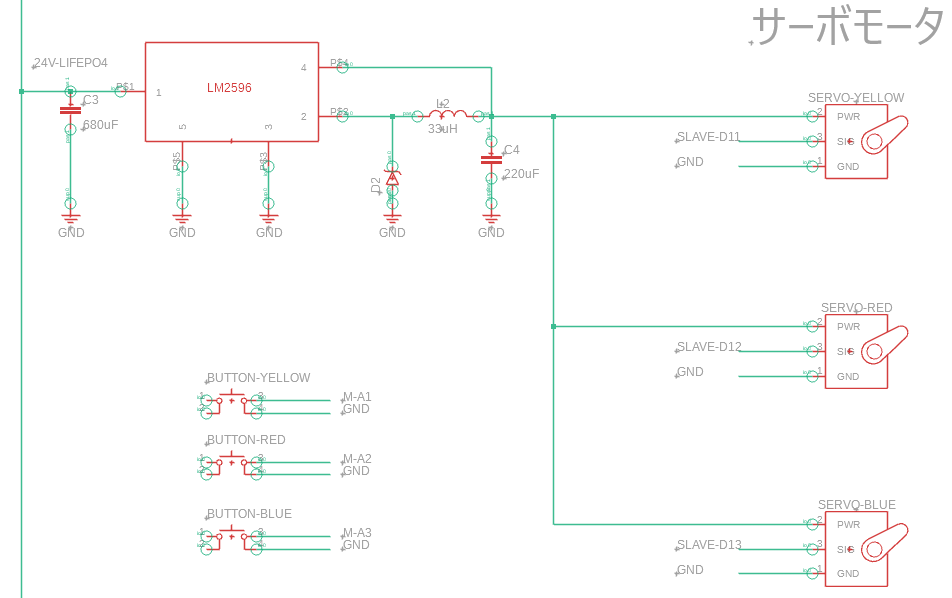 ストック機構に使用されている3つの風船ボタンおよび、電源モジュール付きの3つのサーボモータの配線図を図5に示す。
