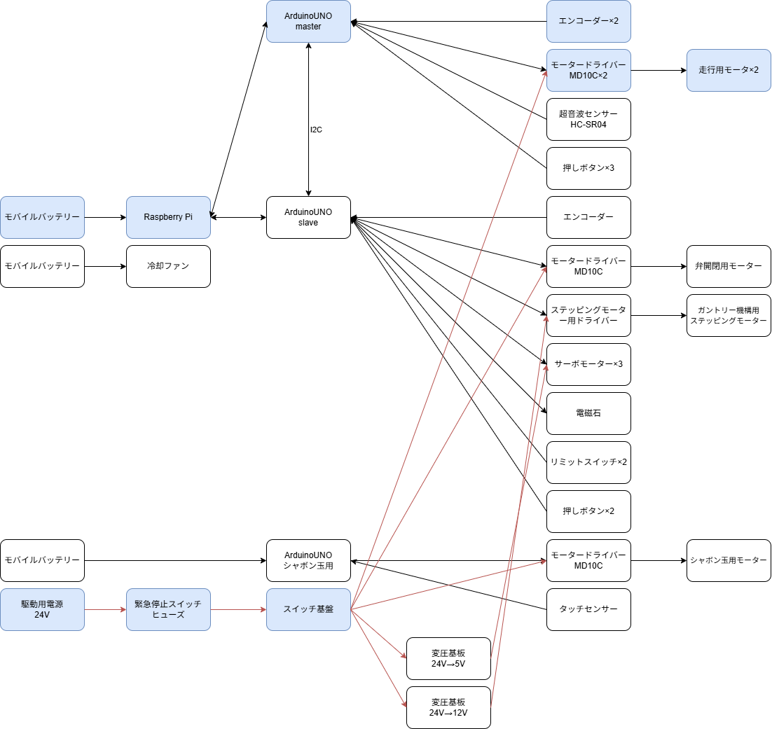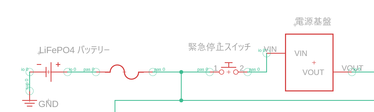 標準機には、24V主電源バッテリ、ヒューズ、緊急停止スイッチ、電源基板が搭載されている。 これらの配線図を図2に示す。