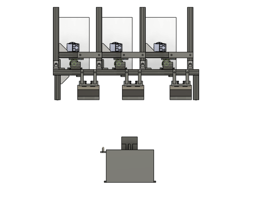 ストック機構についたボタンで風船の色(レーン)が選ばれると、ガントリー機構により対象のレーンの風船ストックの前にノズルの位置が調整される。