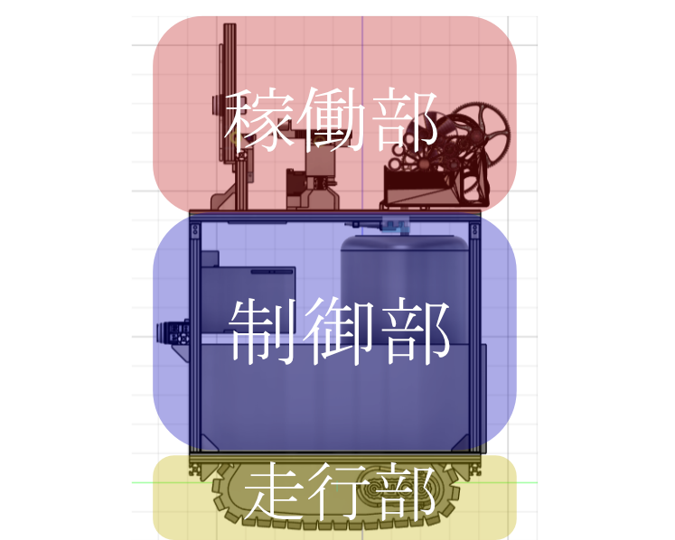本機体は走行部、制御部、稼働部で構成される。