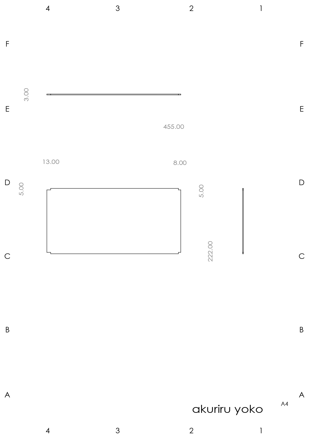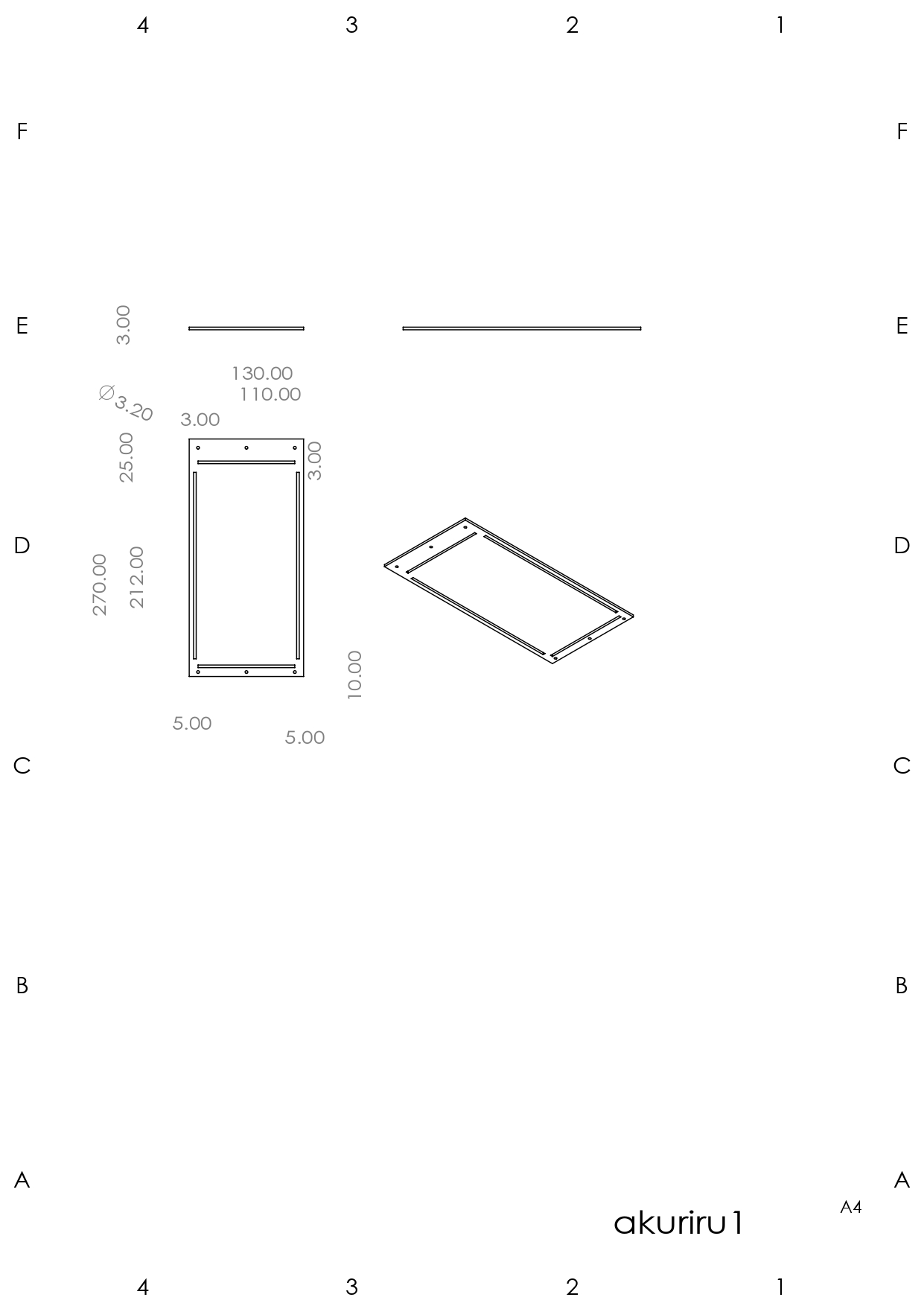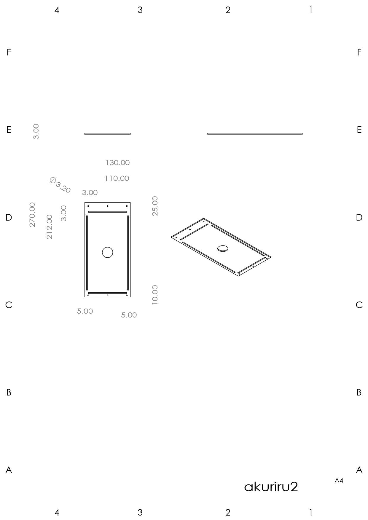 回路部分およびPCを保護するケースの全体図面を図5に示す。また、ケースを構成するアクリル部品として、上部パネル・下部パネル・長辺側面パネル・短辺側面パネルをそれぞれ図6、図7、図8、図9に示す。さらに、中間仕切り、内側仕切り、外側仕切りについては、それぞれ図10、図11、図12に示す。