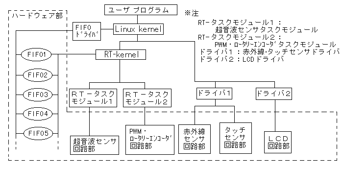 ロータリーエンコーダ・PWM制御用ソフトではRT-タスクを1つ、FIFOを3つ使用する。各タスク、FIFOの番号と機能は下記の通り