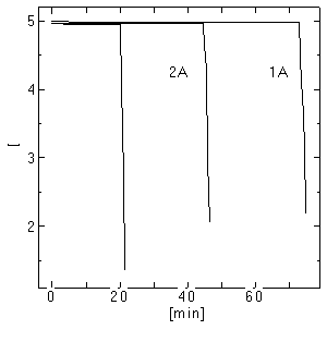 表5−1は計測結果、図5−1は電源であるバッテリーの電圧、図5−2はボードから出力された電圧を表している。図5−2より、1Aでは73分、2Aでは44.5分、3Aでは20分までは安定した出力であった。競技時間は10分であることを考えるとこのボードはMIRS競技をする上で十分な時間であると言える。また、この間放熱板は、かなり温度が上がるが、出力その他の機能には影響を及ぼさないことも確かめられた。これらの事より、このボードは実際のMIRSに使用しても問題はないと思われる。
